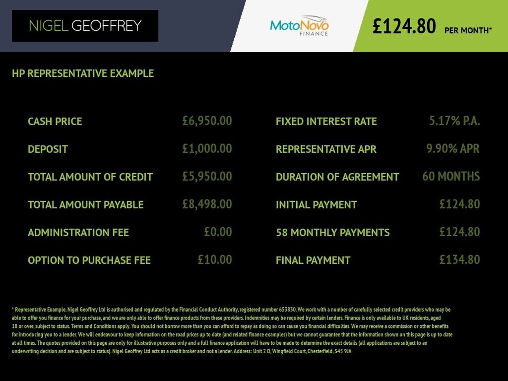 Rates from 9.9% APR: the exact rate you will be offered will be based on your circumstances, subject to status. Representative example: borrowing £7,000 over 5 years with a representative APR of 21.9%, the annual interest rate of 21.9% (Fixed) and a deposit of £0, the amount payable would be £185.33 per month, with a total cost of credit of £4,119.81 and a total amount payable of £11,119.81. We look to find the best rate from our panel of lenders and will offer you the best deal that you're eligible for. We receive a fixed fee commission per finance agreement, or we receive a commission based on a percentage of the total amount of finance taken. This will not affect the interest rate offered or the total amount repayable. Our service is free.