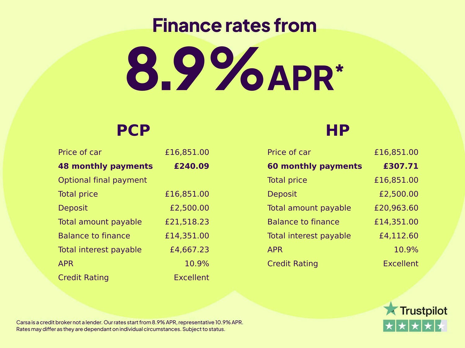 Rates from 9.9% APR: the exact rate you will be offered will be based on your circumstances, subject to status. Representative example: borrowing £7,000 over 5 years with a representative APR of 21.9%, the annual interest rate of 21.9% (Fixed) and a deposit of £0, the amount payable would be £185.33 per month, with a total cost of credit of £4,119.81 and a total amount payable of £11,119.81. We look to find the best rate from our panel of lenders and will offer you the best deal that you're eligible for. We receive a fixed fee commission per finance agreement, or we receive a commission based on a percentage of the total amount of finance taken. This will not affect the interest rate offered or the total amount repayable. Our service is free.