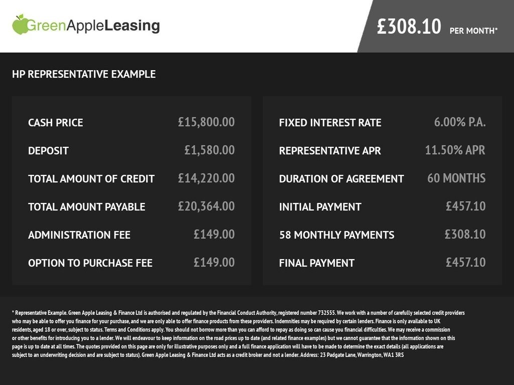 Rates from 9.9% APR: the exact rate you will be offered will be based on your circumstances, subject to status. Representative example: borrowing £7,000 over 5 years with a representative APR of 21.9%, the annual interest rate of 21.9% (Fixed) and a deposit of £0, the amount payable would be £185.33 per month, with a total cost of credit of £4,119.81 and a total amount payable of £11,119.81. We look to find the best rate from our panel of lenders and will offer you the best deal that you're eligible for. We receive a fixed fee commission per finance agreement, or we receive a commission based on a percentage of the total amount of finance taken. This will not affect the interest rate offered or the total amount repayable. Our service is free.
